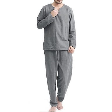 Per uomo Pigiami Top e pantalone del pigiama 2 pezzi Colore puro Informale Interni Giornaliero Misto cotone Traspirante Girocollo Manica lunga Pantalone Estate Primavera Bianco Kaki
