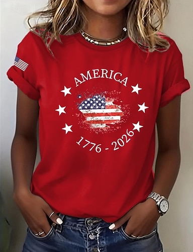 Giorno dell'Indipendenza Americana Per donna Maglietta Stampato Grafico Lettera Bandiera Americana Vintage Elegante Classico Manica Corta Girocollo Top Regolari Quotidiano Rosso Estate Primavera