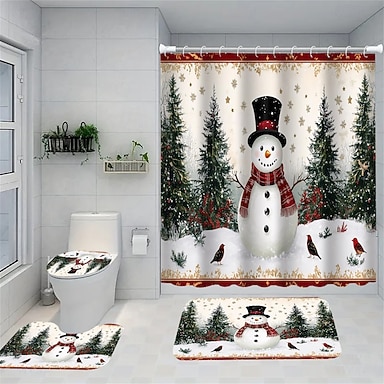 tenda da doccia in quattro pezzi, con sedile del water antiscivolo e robusto e tappetino per il bagno, motivo natalizio con pupazzo di neve e albero di Natale, materiale in poliestere impermeabile con