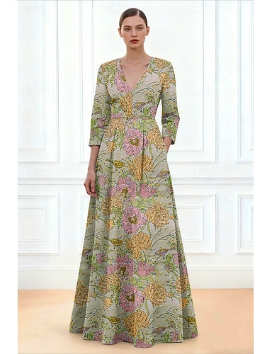 Linea ad A Lunghezza al pavimento Abito Formale Abiti da Cocktail Abito da Sera Da principessa Abito formale Elegante Manica 3/4 Scollo a V Festa in giardino Matrimonio Jacquard con Tasca