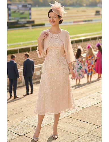 Abito da ballo in stile Sheath Column fino al ginocchio Abito da festa Abito da cocktail Abito per la madre della sposa maniche lunghe scollo rotondo elegante vintage festa con perline