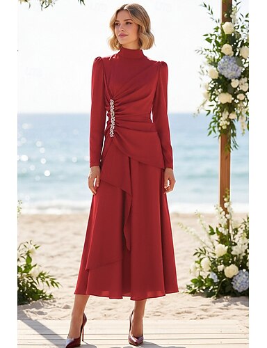 Linea ad A Asimmetrico Lunghezza alla caviglia Abito da invitata a nozze Abiti per invitati a matrimoni Elegante Quotidiano Manica Lunga Collo Alto Matrimonio Formale Shiena scoperta con Cristalli