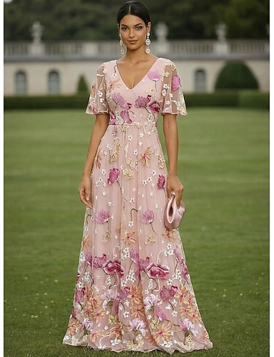 Abito Lunghezza al pavimento Abito da invitata a nozze Abito Formale Abito svasato Abito da cerimonia per signora Manica Corta Scollo a V Elegante Vintage Ospite di nozze Serata Formale Ricevimento
