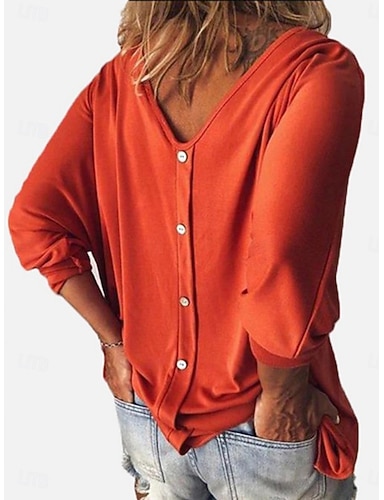 T-Shirt Donna Colore Unito Stile Casual Manica Lunga Collo a V Top Regolari Giornalieri Bottoni Blu Nero Bianco Vino Verde Militare Estate Primavera Autunno