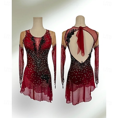 Abito da pattinaggio artistico Per donna Ragazze Pattinaggio sul ghiaccio Vestito Rosso Patchwork Schiena aperta Rete Spandex Alta elasticità Allenamento Competizione Vestiti da pattinaggio sul