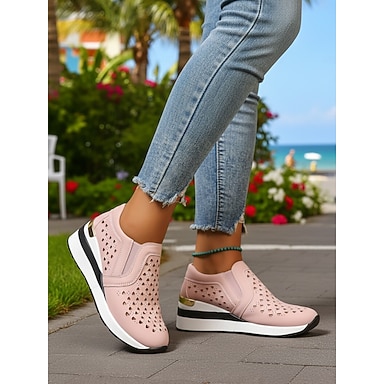 Sneakers da donna con zeppa rosa – scarpe da passeggio traspiranti con inserti intagliati e dettaglio dorato sul tallone per viaggi, lavoro e gite estive