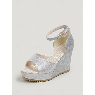 Sandali con zeppa da donna color argento glitterato con cinturini metallici alla caviglia – per le vacanze &scarpe da sera da resort