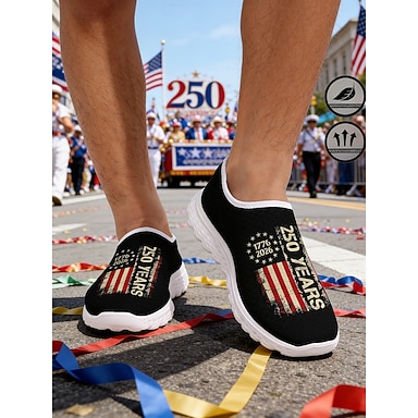 Sneakers slip-on patriottiche nere da uomo: scarpe da passeggio leggere e traspiranti con stampa della bandiera americana e grafica per celebrare i 250 anni, ideali per il tempo libero, eventi