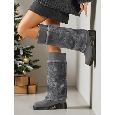stivali alti fino al ginocchio in pelliccia sintetica marrone da donna – stivali pelosi con tacco spesso, comode calzature invernali alla moda da indossare tutti i giorni