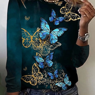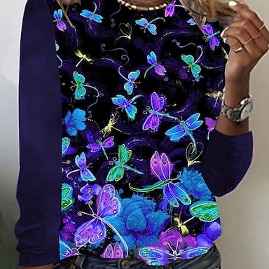 Maglietta da donna a maniche lunghe con collo rotondo tunica grafica farfalla piante vintage elegante casual top regolari quotidiani stampa weekend gialla blu viola autunno