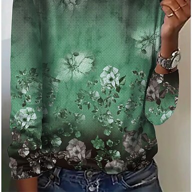 Camicia da donna a tunica con bottoni colletto maniche lunghe grafica floreale ombreggiata vintage quotidiana stilosa scollatura a V regolare top da lavoro quotidiano stampa verde salvia blu viola