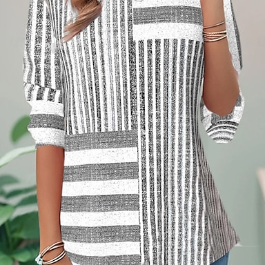 Maglietta da Donna a Maniche Lunghe Collo Rotondo a Maniche Lunghe Tunica Ombre Casual Superiori Regolari Quotidiani Stampa Nera e Bianca Primavera Autunno Pre-autunno