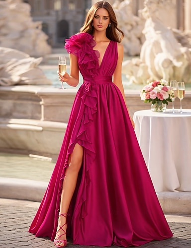 Linea ad A Lunghezza al pavimento Abiti da Ballo Abito da Sera Stile Celebrità Senza Maniche Monospalla Balli di fine anno Formale Organza con Arricciato Volant Spacco