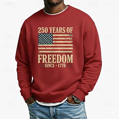 Felpa da uomo con grafica, bandiera americana, 250° anniversario, sportiva, moda, quotidiano, classica, girocollo, per attività all'aperto, vacanza, blu, nero, rosso, verde, stampa, primavera,