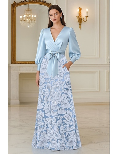 Tubino Colonna Lunghezza al pavimento Abito da invitata a nozze Abito Formale Abito da sera Abito da cerimonia per signora Manica Lunga Scollo a V Elegante Semplice Formale Ospite di nozze Raso con