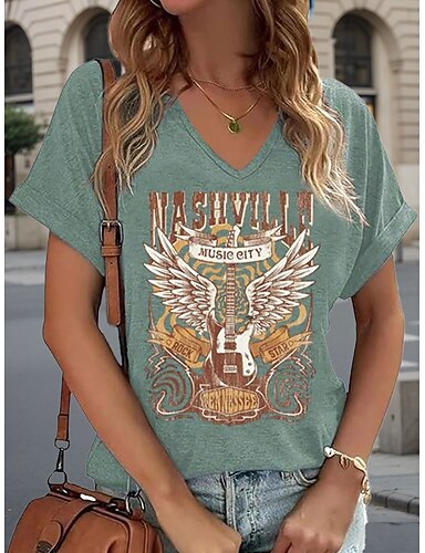 Festival musicale Per donna Maglietta Stampato Grafico Lettera Vintage Elegante Classico Manica Corta Scollo a V Top Regolari Quotidiano Weekend Abbigliamento da vacanza Nero Verde Rosa / nero Estate
