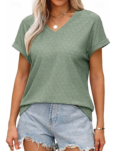 Per donna T-shirt con ricamo a occhielli Polsino arrotolato Testurizzato Tinta unica Elegante Casual Manica Corta Manica a pipistrello Scollo a V Top Regolari Quotidiano Uscire Nero Bianco Rosa