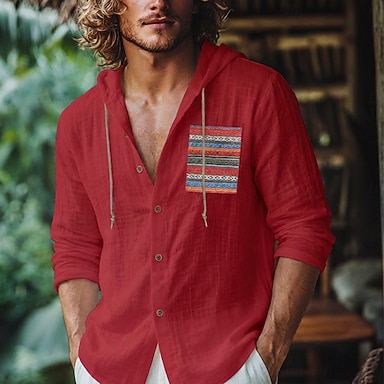 Per uomo Camicia Camicia di lino Camicia Estiva Camicia da Spiaggia Camicia con Bottoni Camicia con cappuccio Boho Casuale Vacanza Rosso Manica Lunga Con Cappuccio Estate Primavera Abbigliamento