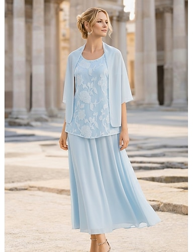 Due Pezzi Linea ad A Lunghezza Tè Abito da invitata a nozze Abito da cerimonia per signora Manica 3/4 Collo gioiello Elegante Ospite di nozze Festa di fidanzamento Chiffon con Perline