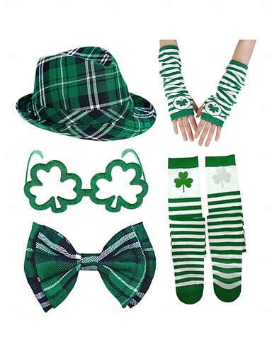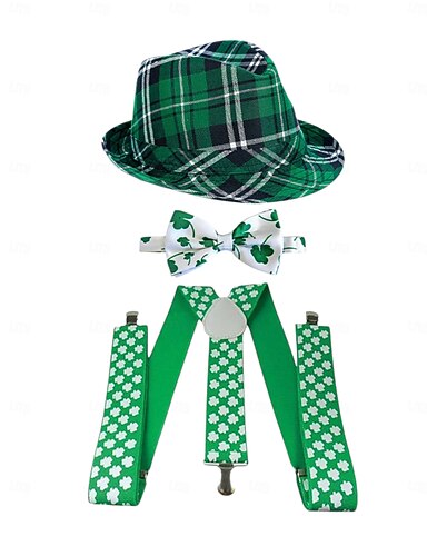 set di accessori per costumi da uomo per il giorno di San Patrizio, cappello a quadri verdi, papillon e bretelle, materiale in poliestere con molteplici fantasie, costume da parata e festa irlandese per uomo