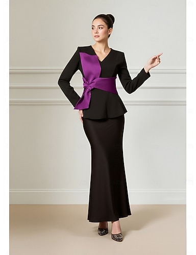 Due Pezzi Tubino Colonna Abito Lunghezza alla caviglia Abito da invitata a nozze Abito da cerimonia per signora Manica Lunga Scollo a V Elegante Abito Nero Formale Ricevimento di matrimonio Riunione