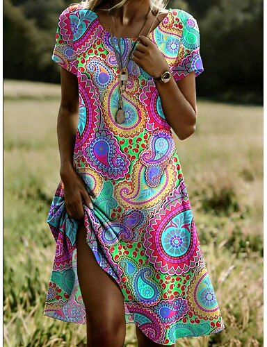 Per donna Abito Midi Vestito Estivo Vestito T-Shirt Abito a trapezio Abito Estivo Vacanza Casual Quotidiano Ferie Uscire Vestibilità comoda Grafico Paisley Tribale Manica Corta Girocollo Viola Fucsia