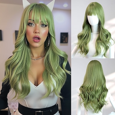 Parrucca ondulata verde sfumata da 22 pollici con frangia – parrucca lunga verde erba, ideale per costumi di Halloween e cosplay. &servizi fotografici