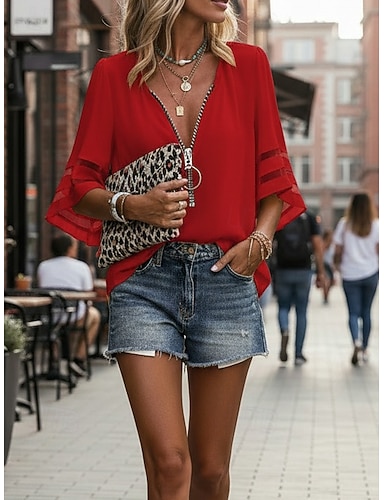 Per donna Camicia Estiva Camicia casual Blusa Tinta unica Semplice Vacanza Elegante Essenziale Manica Corta Scollo a V Top Regolari Quotidiano Spiaggia Ferie Blu Nero Viola Verde Cachi Estate