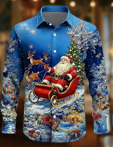 Natale Per uomo Babbo Natale Fiocco di neve Slitta Camicia Camicia con Bottoni Manica Lunga Divertente Regali di Natale Ferie Primavera Autunno Collo ripiegato Stampa 3D camicie con colletto Blu Blu
