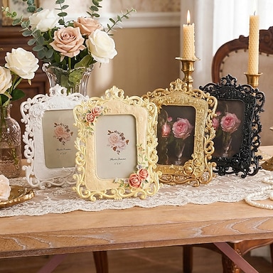 1 pezzo, una cornice per foto con rose in rilievo in stile europeo e motivi classici tridimensionali, realizzata in resina, adatta per la decorazione della casa e cornici per foto per camere da letto