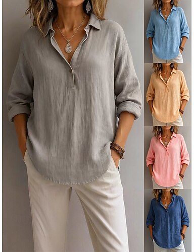 Per donna Blusa Finto cotone e lino Tinta unica Quotidiano Elegante Essenziale Manica Lunga Colletto a Camicia Top Regolari Quotidiano Blu Rosa Azzurro cielo Arancione Grigio Primavera Autunno