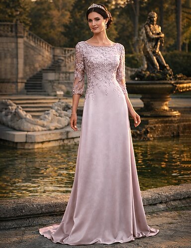 Tubino Colonna Abito Lunghezza al pavimento Abito da invitata a nozze Abito Formale Abito da sera Abito da cerimonia per signora Manica 3/4 Scollo a Barca Elegante Ricevimento di matrimonio Raso con