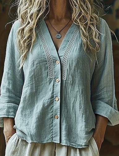 Per donna Camicia Blusa Finto cotone e lino Bottoni Semplice Bohemien Casual Manica Lunga Scollo a V Top Regolari Quotidiano Ferie Blu Grigio Estate Primavera