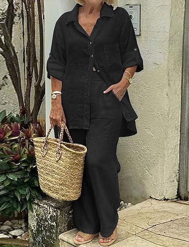 Set da donna in cotone e lino, due pezzi, nero, bianco, blu, tinta unita, con bottoni, 2 pezzi, moda quotidiana, colletto a camicia, vestibilità regolare, taglia S