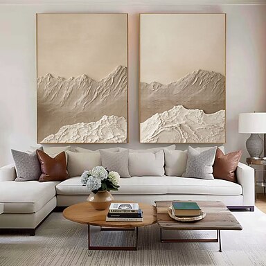 dipinto astratto fatto a mano beige e bianco con texture minimalista wabi-sabi, texture moderna, impasto beige, set di 2 montagne, arte murale astratta