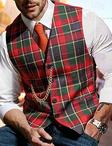 Per uomo Gilet All'aperto Carnevale Feste Ufficio / Carriera Moda Streetwear Primavera Autunno Bottoni Poliestere Tessuto Traspirabilità Plaid Monopetto Scollo a V Vestibilità su misura Rosso Gilet
