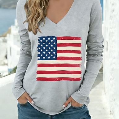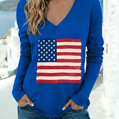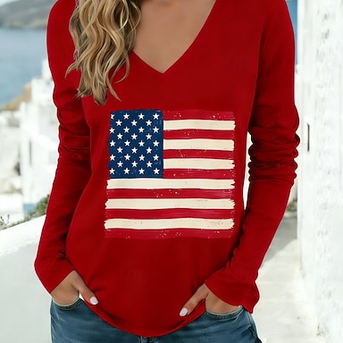 Giorno dell'Indipendenza Americana Per donna Maglietta Stampato Grafico Bandiera Americana Elegante Classico Casual Manica Lunga Scollo a V Top Regolari Quotidiano Bianco Rosso Cachi Primavera Autunno
