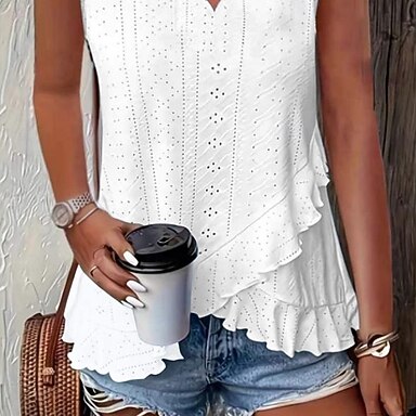 Per donna Blusa Volant Traforato Tinta unica Elegante Casual Manica Corta Scollo a V Top Regolari Quotidiano Blu Bianco Giallo Rosa Verde Estate