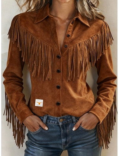 Per donna Camicia Camicia casual Blusa Bottoni Frange Semplice Vintage Western Classico Manica Lunga Colletto a Camicia Top Regolari Quotidiano Ferie Uscire Marrone Primavera Autunno