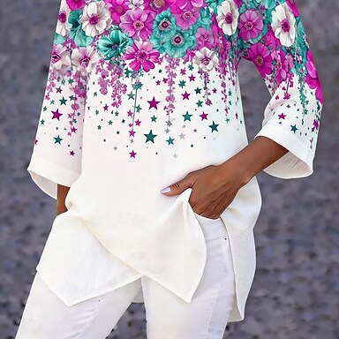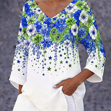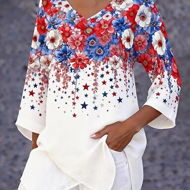 Blusa da donna con bottoni grafica floreale elegante alla moda casual maniche 3/4 scollo a V top regolari quotidiani vacanze uscita stampa bianco rosa blu estate primavera
