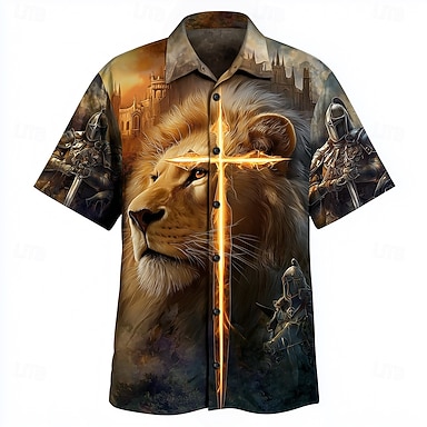 Per uomo Leone Cavalieri Templari Croce Camicia Camicia con Bottoni Manica Corta Vintage Retrò Abbigliamento casual alla moda Vacanza Estate Primavera Collo ripiegato Stampa 3D camicie con colletto