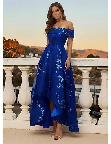 Linea ad A Asimmetrico Lunghezza al pavimento Perline ricamate Abito da invitata a nozze Abito Formale Abito da cerimonia per signora Manica Corta Senza Spalle Elegante Formale Raso con Paillettes