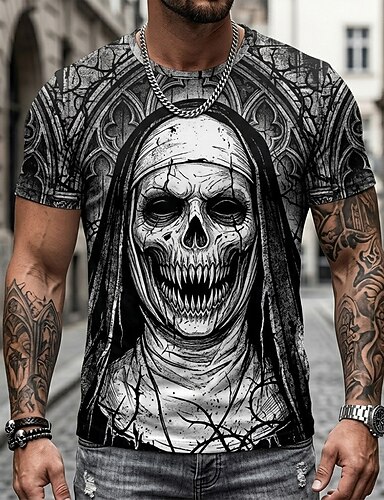 Maglietta da uomo con stampa integrale di teschio malvagio, suora, cattedrale gotica, horror, dark, macabro, metal, vestibilità regolare, streetwear, Halloween, festa, abbigliamento firmato, taglie S,