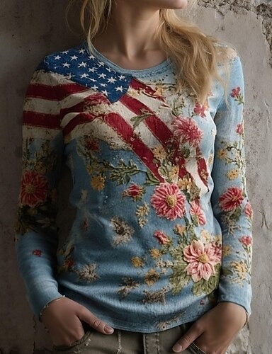 Giorno dell'Indipendenza T-Shirt Patriottica da Donna Grafica Bandiera Vintage Elegante Casual Maniche Lunghe Collo Tondo Magliette Regolari Quotidiane Weekend Stampa Blu Estate Primavera Autunno