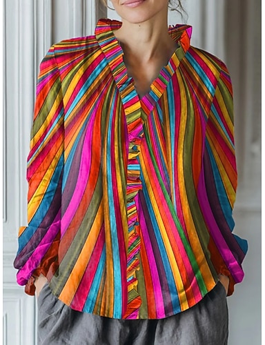 Per donna Camicia Boho Volant Grafico A righe Elegante Vintage Quotidiano Manica Lunga Scollo a V Top Regolari Quotidiano Lavoro Ferie Blu Rosa Rosso Marrone Verde Estate Primavera Autunno Inverno