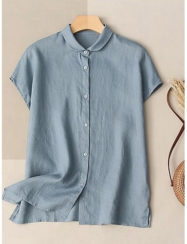 Per donna Blusa Finto cotone e lino Bottoni Tinta unica Elegante Casual Manica Corta Colletto a Camicia Top Regolari Quotidiano Blu Bianco Blu marino Verde Estate Primavera
