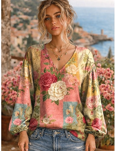 Blusa Boho da donna simile al lino traspirante leggera con grafica floreale elegante bohemien vintage a manica lunga collo a V top regolari quotidiani stampa patchwork a bottoni rosa rosso e rosa