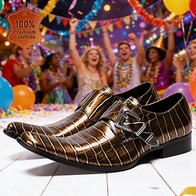 Mocassini da uomo da Mardi Gras con fibbia metallici dorati – Scarpe in pelle di vacchetta 100% premium con finitura dorata lucida perfette per carnevale feste e occasioni speciali