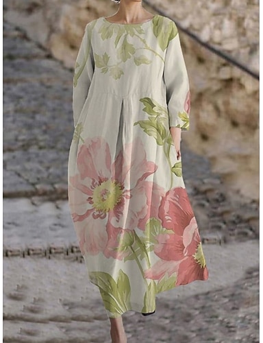 Abito Maxi da Donna in Lino Leggero e Traspirante Vestito Estivo A Linea per Vacanze Casual Boho Spiaggia Uscita Fit Largo Grafica Floreale Maniche 3/4 Collo a Giro Blu Verde Khaki