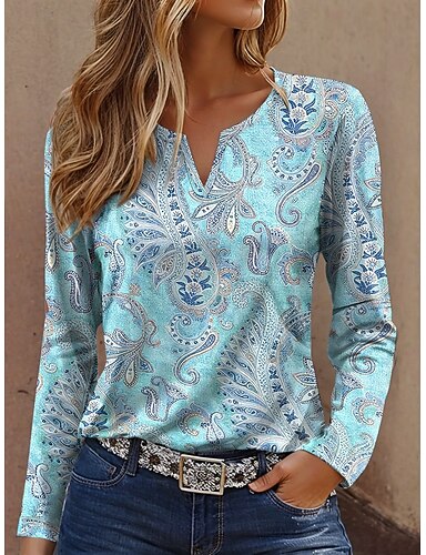 Per donna Maglietta Stampato Grafico Paisley Vintage Moda Casual Manica Lunga Collo a V Top Regolari Quotidiano Blu Rosa Viola Verde Estate Primavera